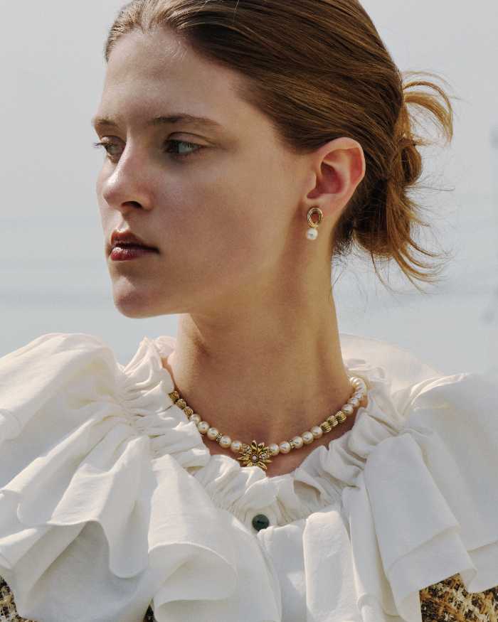 ショートネックレス(24,200円)には、トップにマーガレットモチーフのゴールドパーツをあしらい、控えめながらも存在感のあるデザインに。