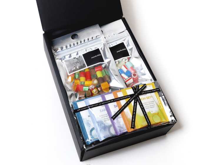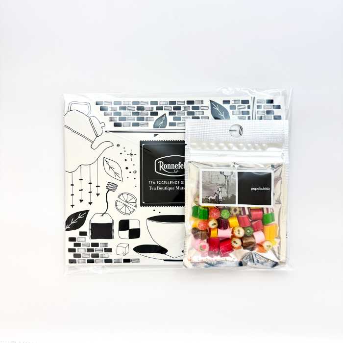 上品でシンプルなギフトボックスには、パパブブレの鮮やかなキャンディとロンネフェルト紅茶が並び、贈り物としても喜ばれます。クリスマスや誕生日、特別な日のプレゼントとしてもぴったり。