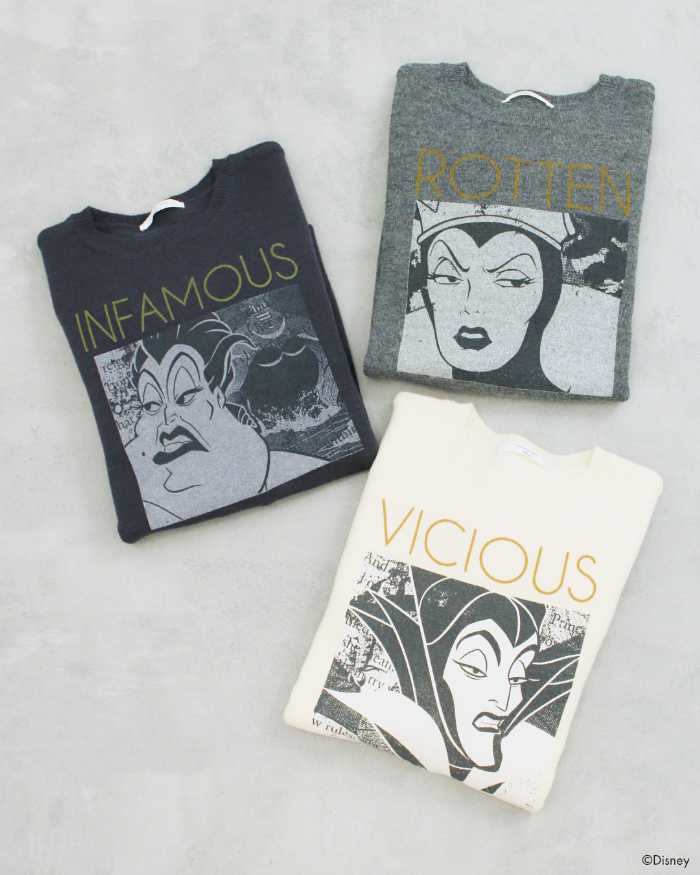 「女王(魔女)」や「アースラ」、「マレフィセント」など、ディズニー映画の名シーンがモノトーンでプリントされたニット(¥5,390)や、ダークカラーが魅力のスウェット(¥4,950)が揃っています♡