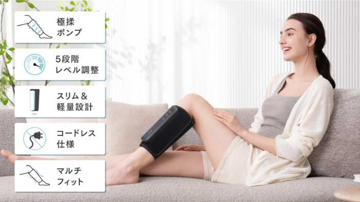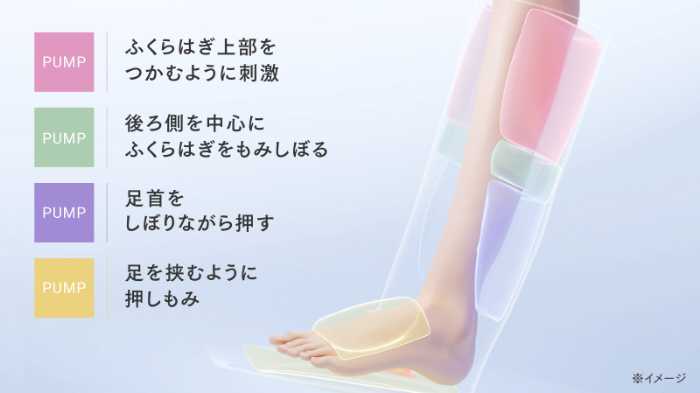 ふくらはぎからつま先まで9つのエアポンプが連動し、まるで手もみのような刺激を再現。