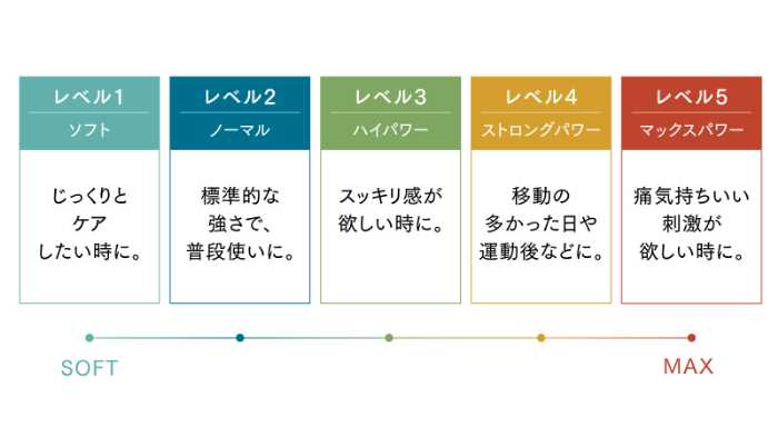 5段階のエアレベル調整により、じっくり癒すモードから心地よい刺激まで自由にカスタマイズ可能です。