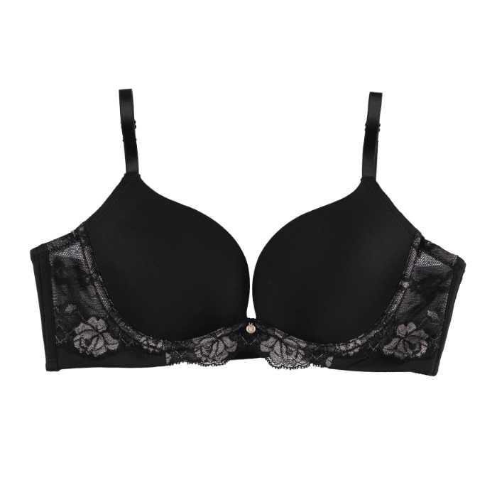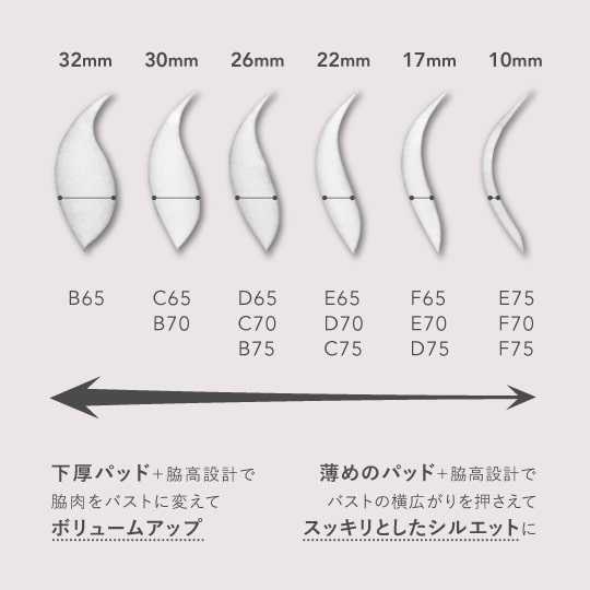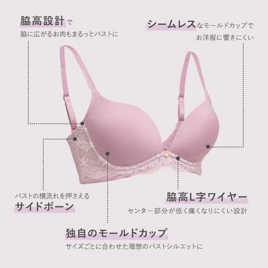 脇からしっかり支える脇高設計と、サイズごとに厚みを変えた独自モールドカップにより、ふっくらとした“まる胸”を実現します。