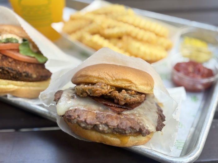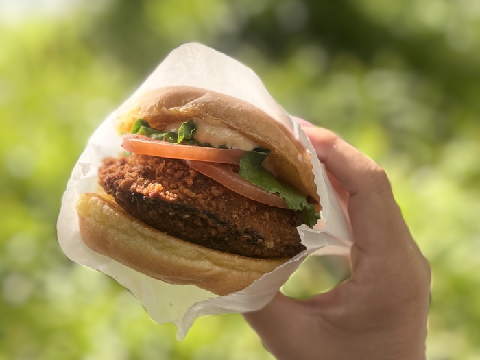 ポートベローマッシュルームで3種類のチーズを包みフライした”シュルーム”、レタス、トマト、シャックソースをトッピングしたノンミートバーガー。噛むととろりとなめらかなチーズが溢れだし、きのこの旨味と相性抜群!