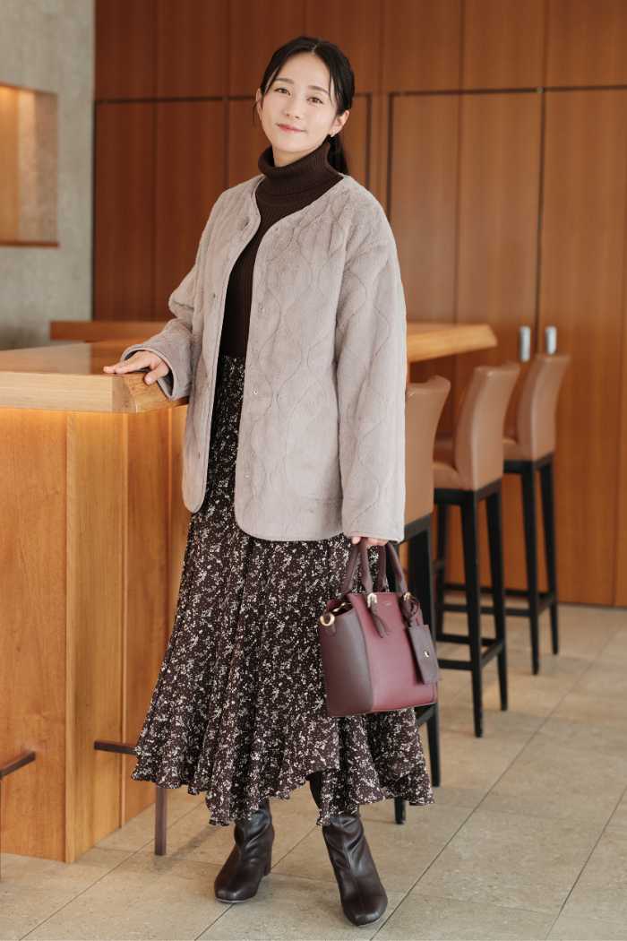 フェイクファー面はふわっと柔らかく、リッチな印象に。プレーン面はシンプルで落ち着いた雰囲気を演出してくれるので、通勤にも休日にも幅広く活躍します。