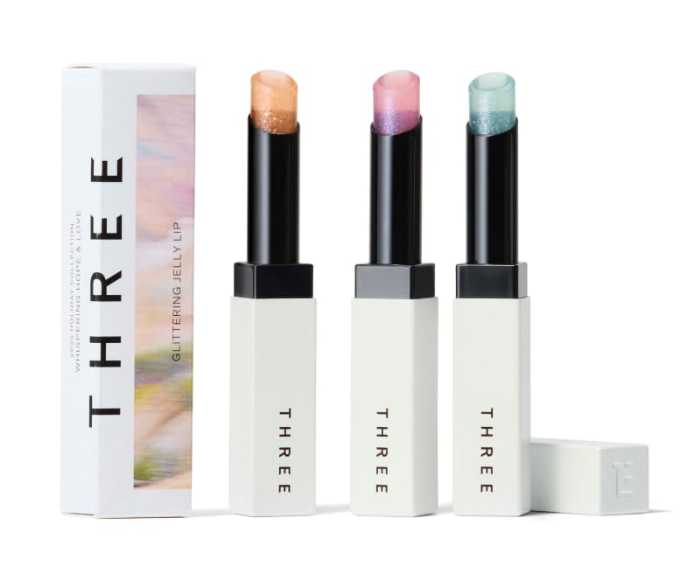 THREE グリタリングジェリーリップ(限定3色 各4,290円税込)は、クリアなジェリーに多彩なパールを封入し、濡れツヤと血色感を両立。