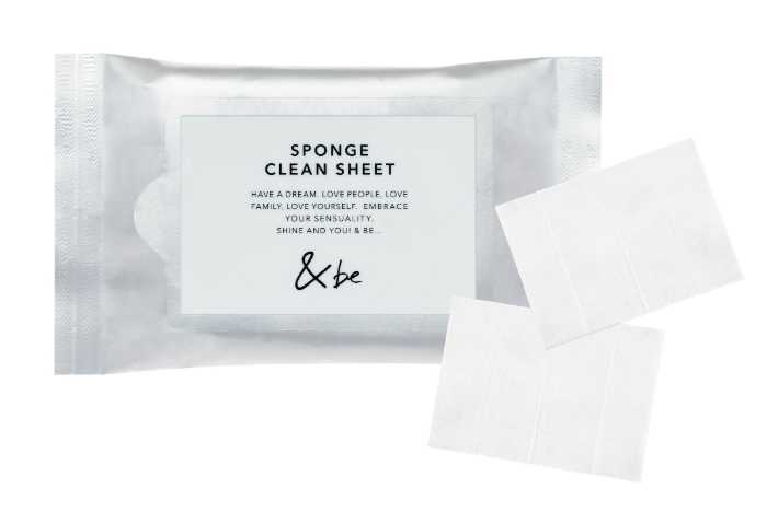毎日使うスポンジは清潔さも大切。「&be スポンジクリーンシート」(20枚入り/550円)は、包んでもみ込むだけでメイク汚れを落とせる便利アイテムです。