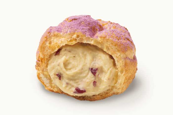 さらに、シュー生地の表面には紫芋パウダーをふんわりトッピング。見た目にも秋らしく、食べる前からワクワクする一品に仕上がっています♪