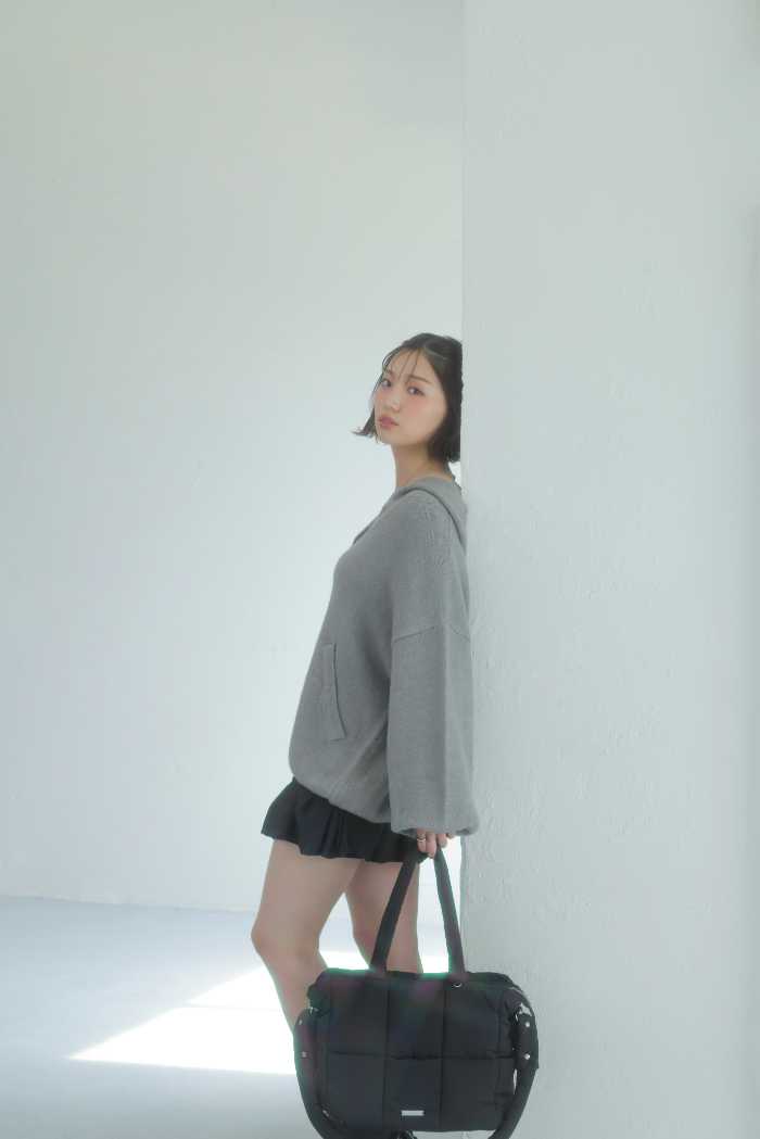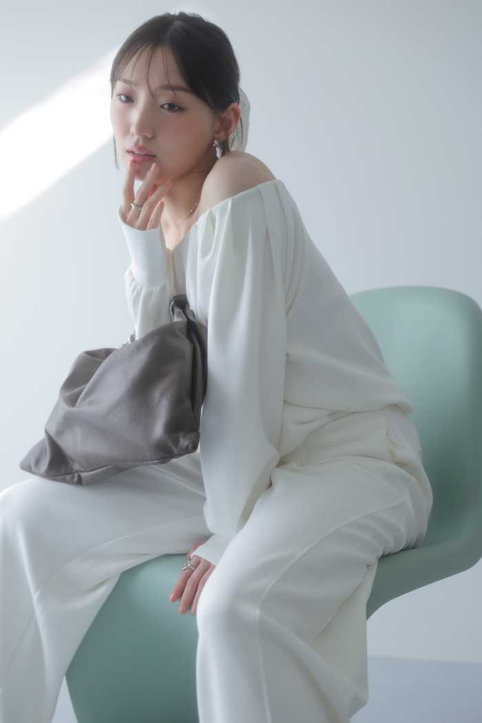 【吉田朱里】タックスリーブオフショルスウェット(8,910円)は、柔らかく伸縮性のあるダンボール素材で、オフショルダーでも快適♡