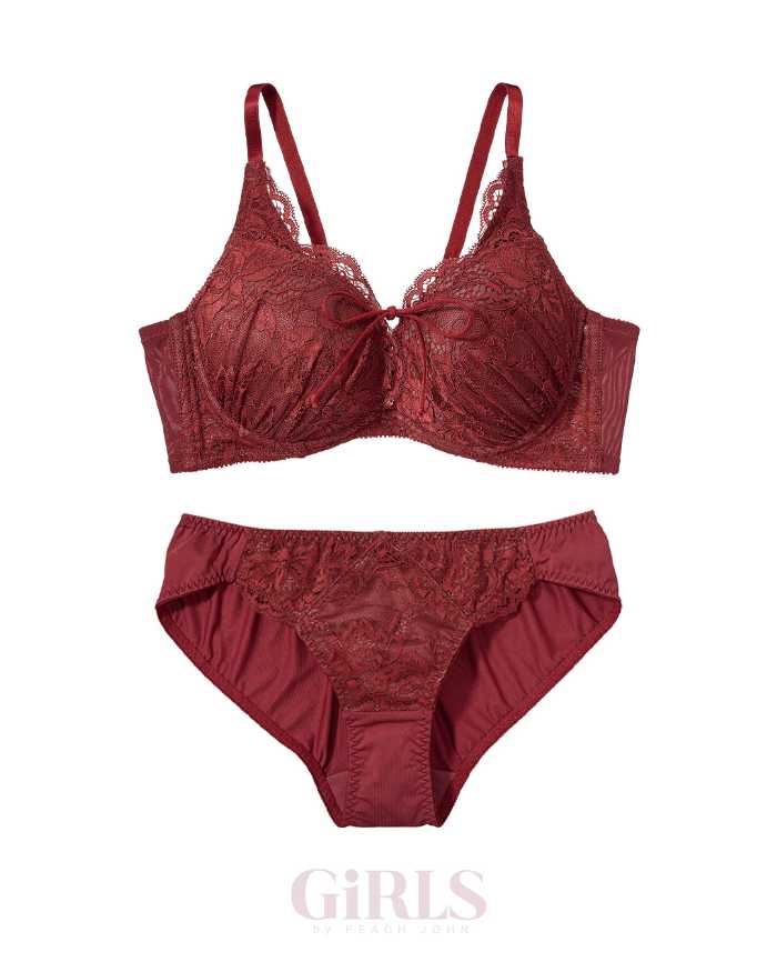 中央のレースアップで谷間を調整できる人気モデル。フェミニンなボルドーカラーがホリデーにぴったり♪