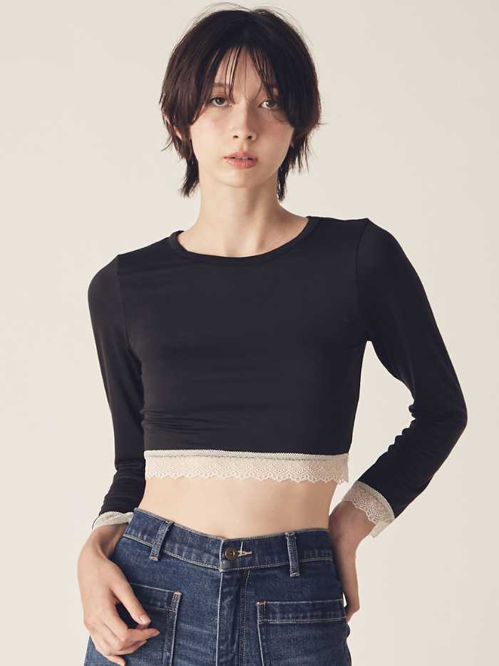 ウエストにレースをあしらい、クロップド丈のトップスとも好相性。短めの着丈で重ね着ももたつかず、シルエットを美しく保ちます。吸湿発熱機能付き。