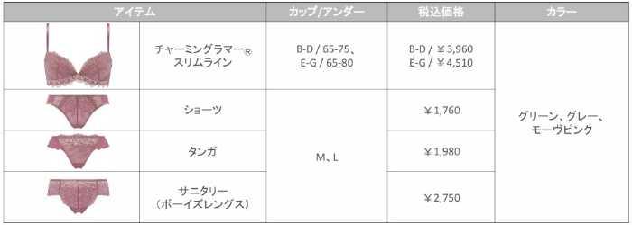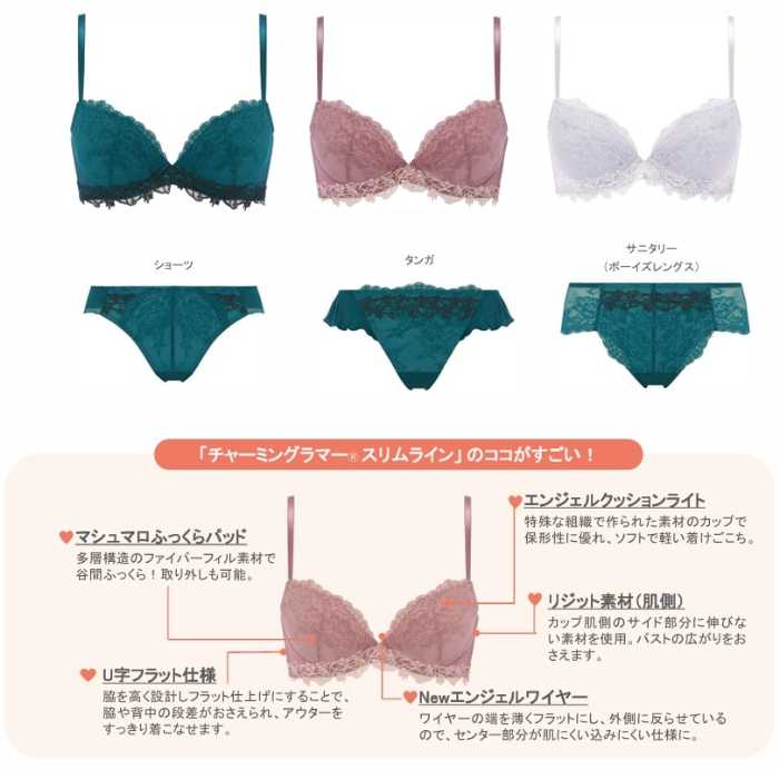 ブラジャーには、ふっくらとした谷間とスリムなシルエットを叶える「チャーミングラマーⓇ スリムライン」を採用。