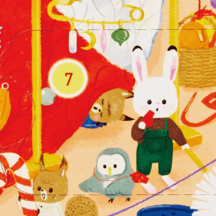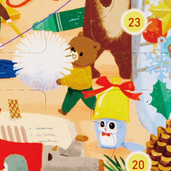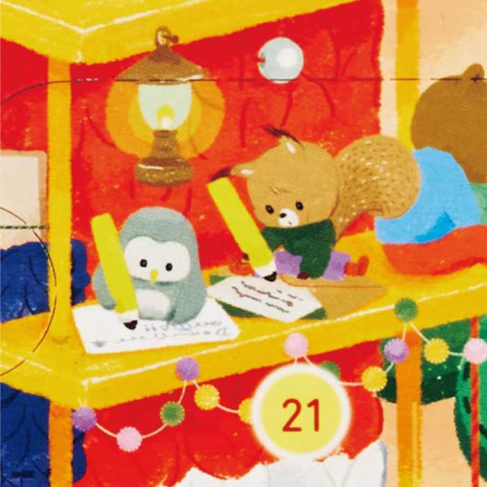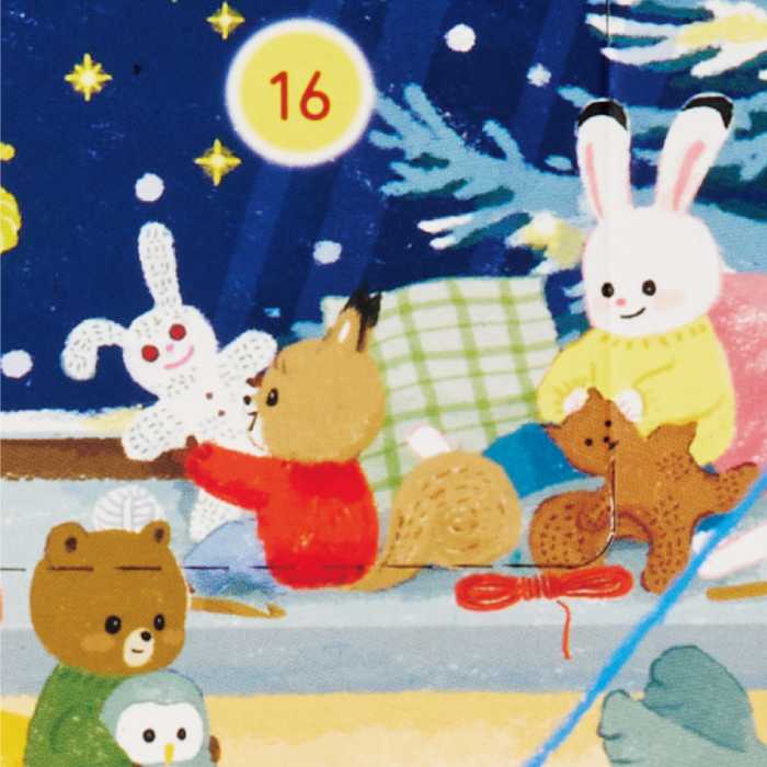 2025年版のテーマは「待ち遠しいクリスマス!みんなで靴下を編もう!」。小さな動物や妖精たちが協力して、サンタさんに届ける大きな靴下を編む様子が描かれています。