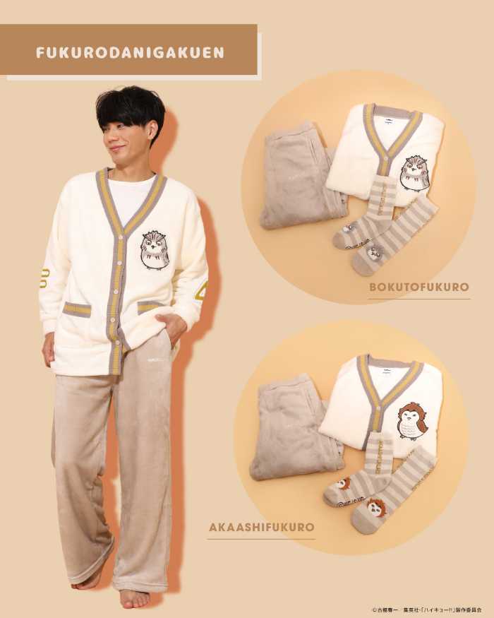 「ハイキュー!!もこもこルームウェア」(全7種)は、アニマルマスコットのサガラ刺繍がキュートなカーディガン&ボトムセット。