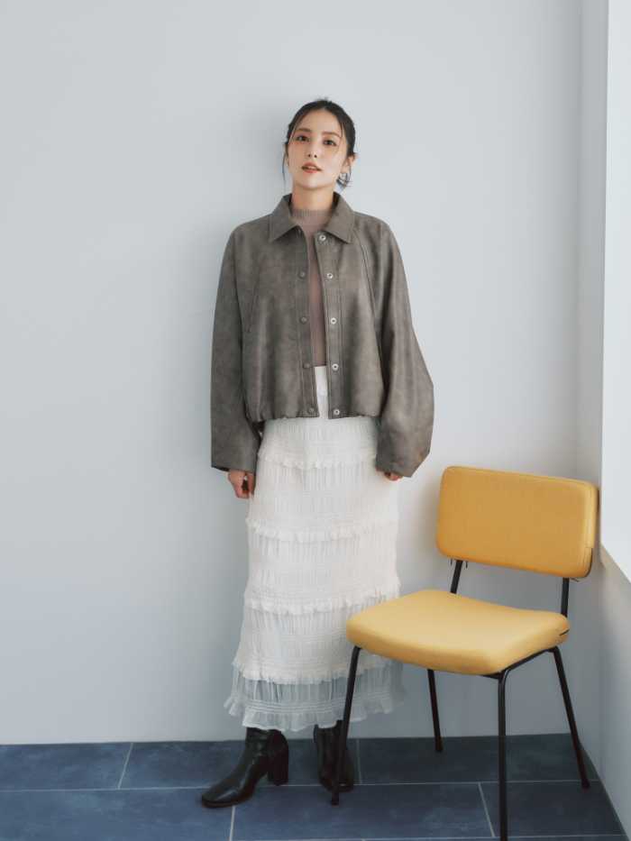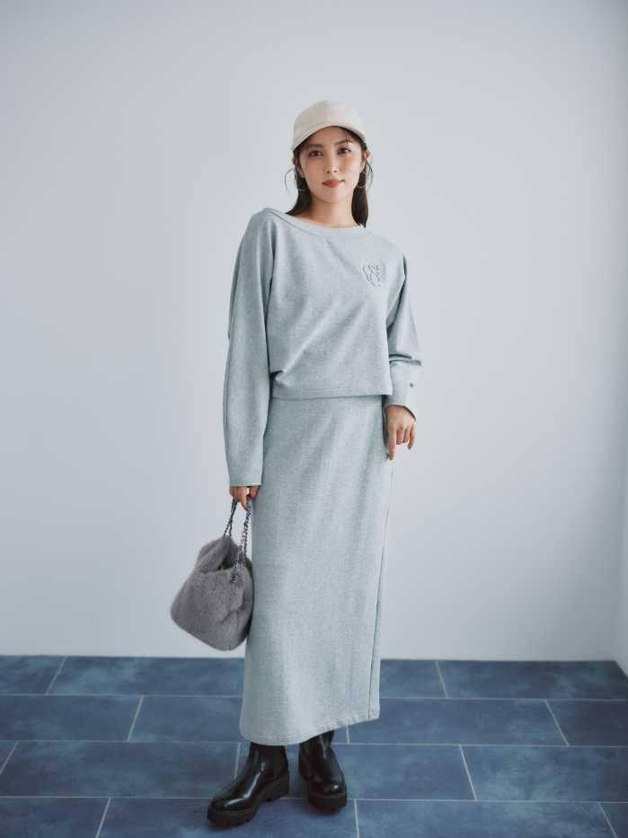 ショート丈のレザーブルゾン(26,400円)にチュールスカート(18,700円)を合わせたレディなスタイルや、プルオーバー×スカートセットアップ(25,300円)の上品なスウェットコーデなど、どんな日も“私らしく”過ごせるラインナップです。