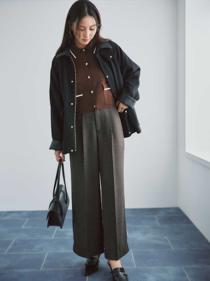 さらに、カシミヤ混のウールジャケット(42,900円)やウール調パンツ(23,100円)など、上質素材をミックスした異素材コーデも登場。