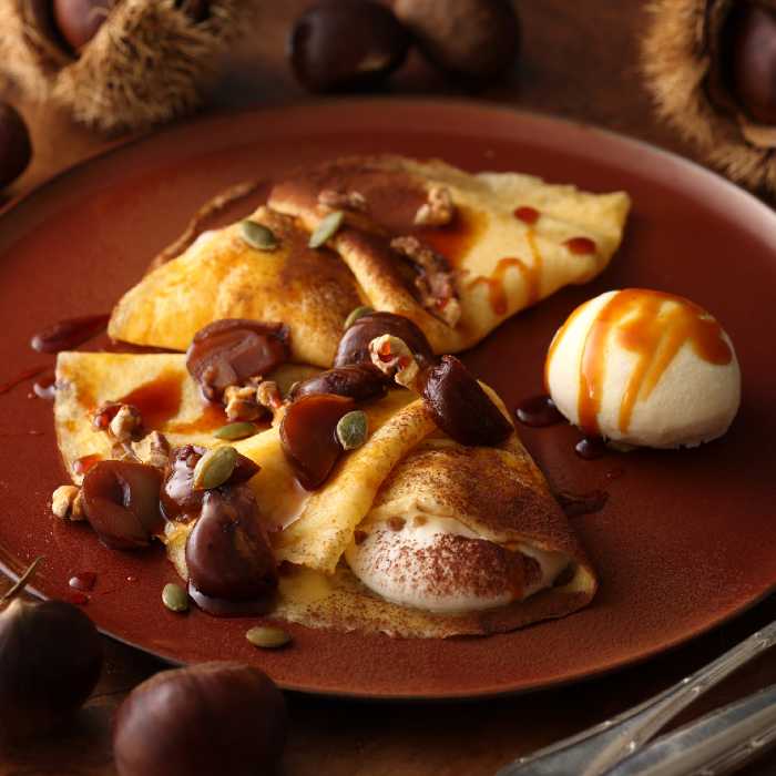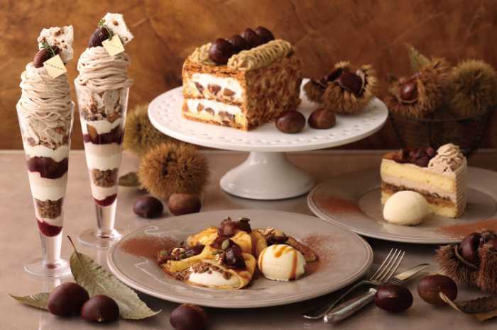 焦がしバター香る「マロンクレープ バニラアイス添え」(1,540円税込)や、2種のマロンクリームを使った「栗のショートケーキ」(1,540円税込)も登場します。