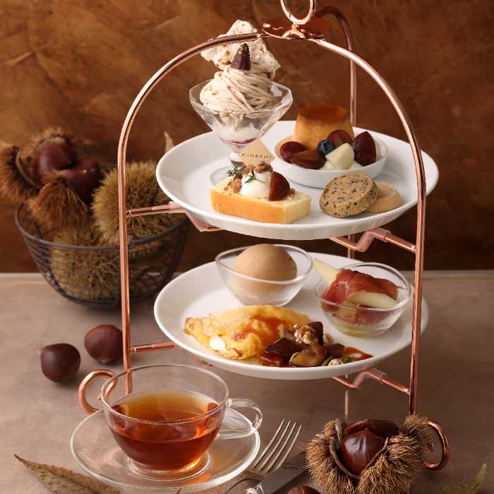 「季節のAfternoon Tea Set」(2,980円税込)では、マロンパフェや栗のプリン、チーズケーキなど、多彩な栗スイーツを一度に味わえます。