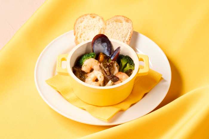 ぷりぷり食感の海老とムール貝、舞茸やしめじなどの具材を、アンチョビとニンニクの旨みが溶け込んだ熱々のオイルソースで仕上げました。
