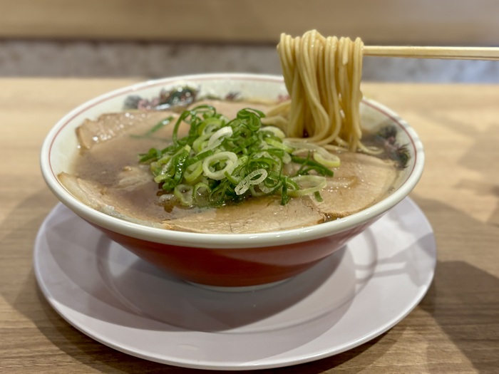 もっちりとした中太ストレート麺は、近藤製麺によるもの。厳選された小麦粉を複数ブレンドし、小麦粉と少量の塩、かん水のみを使用した麺で、スープとの相性抜群!!1947年の創業時から受け継がれてきた味。