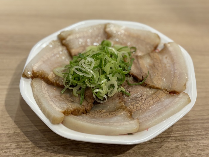 ラーメンでも使用している、こだわりの豚肉を存分に味わいたい!!ほどよい厚さにカットされた、「焼豚」ラーメンと一緒にいただくのはもちろんのこと、ビールやお酒のお供に、「焼豚」は、噛むと、ジューシーな旨みが口いっぱいに広がり、シャキッとした九条ネギがアクセントになっており、お酒とも相性ピッタリ