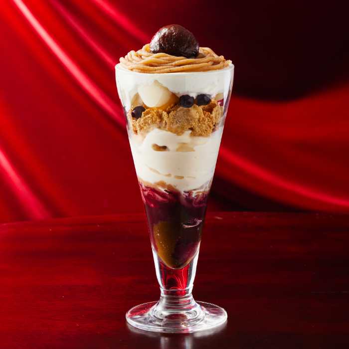 渋皮栗のモンブランあんを主役に、カシスの華やかな酸味と自家製ほうじ茶ゼリーを組み合わせた限定パフェ。