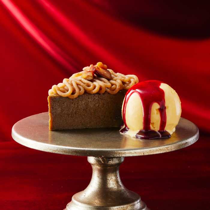 渋皮栗を使ったモンブランあんと栗のトッピングで、見た目も華やかです。別添えのカシスソースをかければ、爽やかな酸味がプラスされ、味の印象が変化。