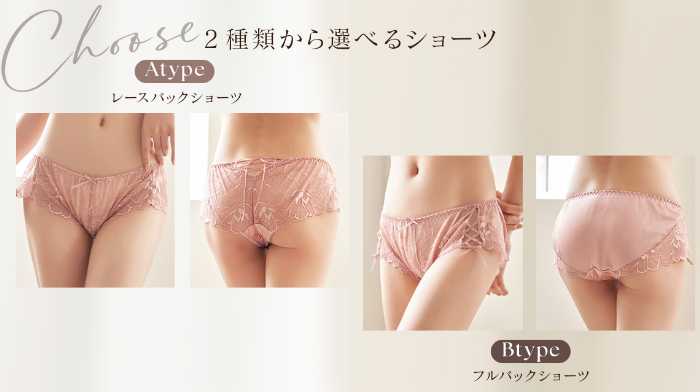お揃いのショーツは「レースバック」と「フルバック」の2タイプ。レースアップや透け感のディテールが美しく、どちらも履き心地なめらか。