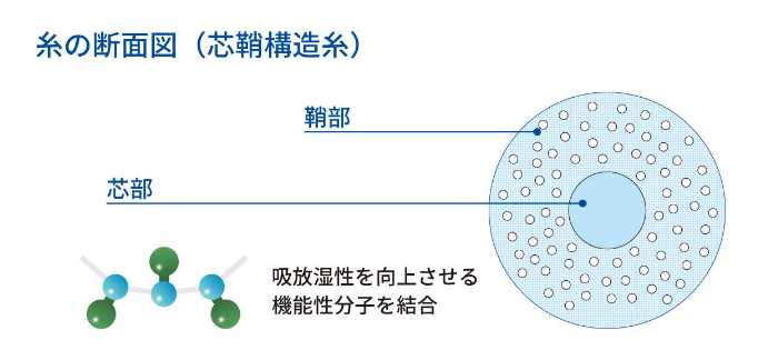 糸の鞘部にある無数のスキマが汗を素早く拡散し、濡れ戻りを抑制。さらに芯部の吸放湿分子が衣服内を快適にキープします。まさに「発熱しながら、アセをドロン※1」する新発想のインナーなんです。