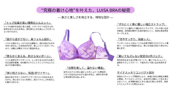 ブランド創業時から続くLUISAシリーズは、“着けた瞬間から体が軽くなる”と評されるほどのフィット感が特長。