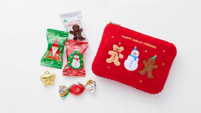 刺繍入りの「クリスマスポーチ」(5個入/990円)は、クリスマスベアやスノーマンのアップリケがポイント。ミルクチョコとクランチチョコを詰め合わせ、見た目も中身もキュートに。