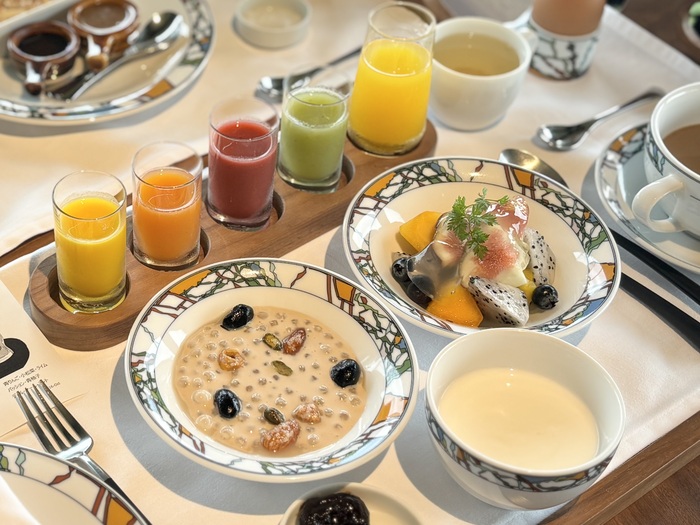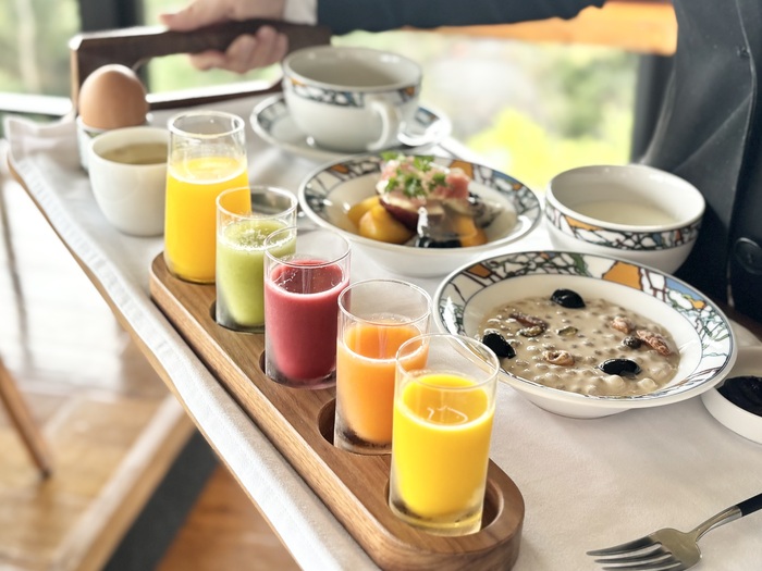 テーブルに運ばれてくる瞬間から、ときめきが始まります。カラフルなグラスに入った、日替わりの旬の野菜やフルーツを低速ミキサーで搾った「飲むサラダ」、身体を心地よく、目覚めさせ、栄養もしっかり摂れ酵素たっぷり!