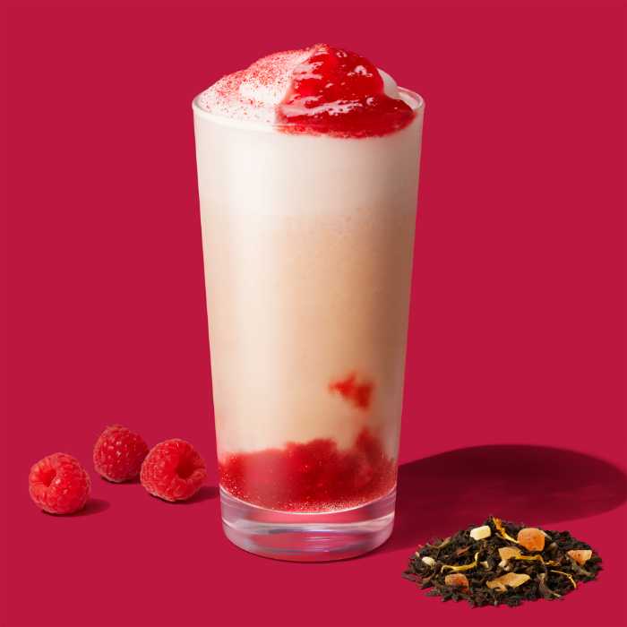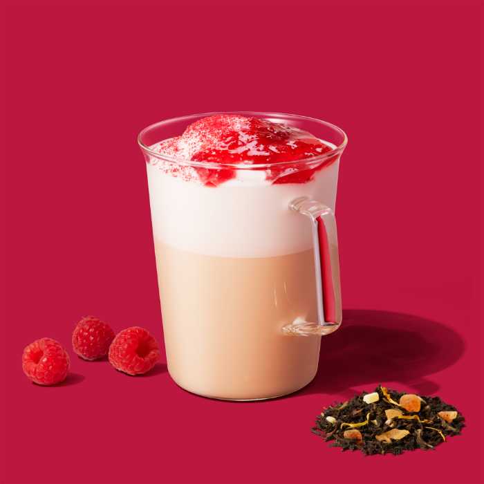 『レッド ラズベリー&ジョイフルメドレー ムース ティー ラテ』(687円/700円)は、ホットとアイスから選べ、ふんわりとしたティームースと果実の甘酸っぱさが溶け合います。