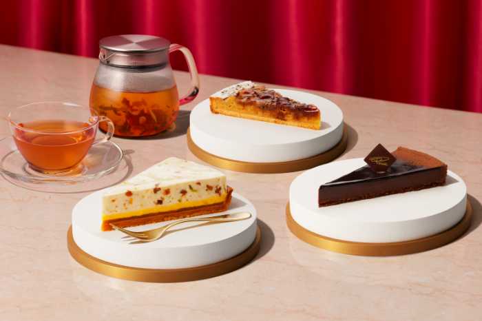 『トルタ トローネ ミエーレ』(1,031円/1,050円)は、はちみつムースとアプリコットソースを重ねた3層仕立て。『ルワンダ ブラック ティー』とのペアリングで気品あふれる味わいに。