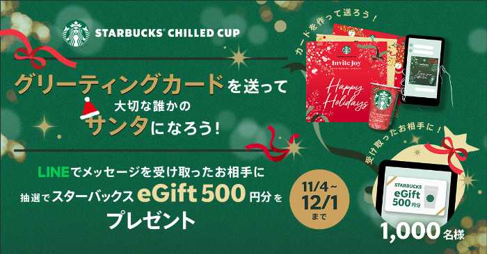 期間中は、LINEで送れる「グリーティングカードキャンペーン」も実施。カードを受け取った方の中から抽選で合計1,000名様に「スターバックスeGift(500円分)」がその場で当たります。