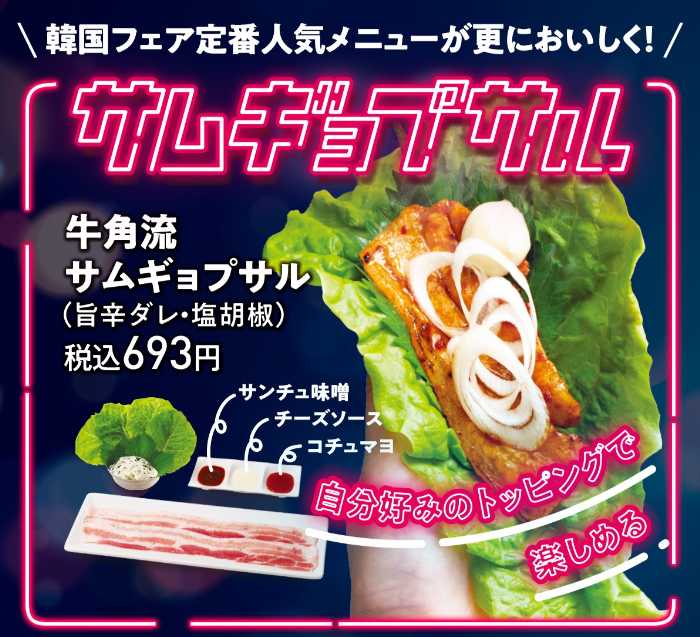 香ばしく焼き上げた『牛角流サムギョプサル』(各693円)は、今年のフェアを代表する逸品。