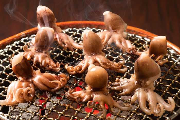 七輪で香ばしく焼き上げる『イイダコの七輪焼き』(638円)も、韓国屋台さながらのライブ感を楽しめます。