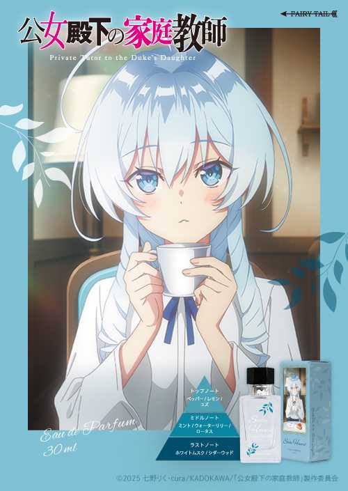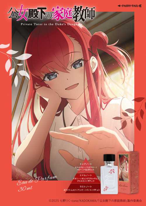フェアリーテイル株式会社から、TVアニメ『公女殿下の家庭教師』をテーマにした香水が登場します。ラインナップは、ティナ・ハワード、リディヤ・リンスター、エリー・ウォーカー、ステラ・ハワードの4種類。それぞれのキャラクターの個性や想いを香りで表現した、ファン待望のコレクションです。予約販売は「DREAMING PRINCESS」「フレグランスファンタジー」などで10月29日(水)よりスタート♡