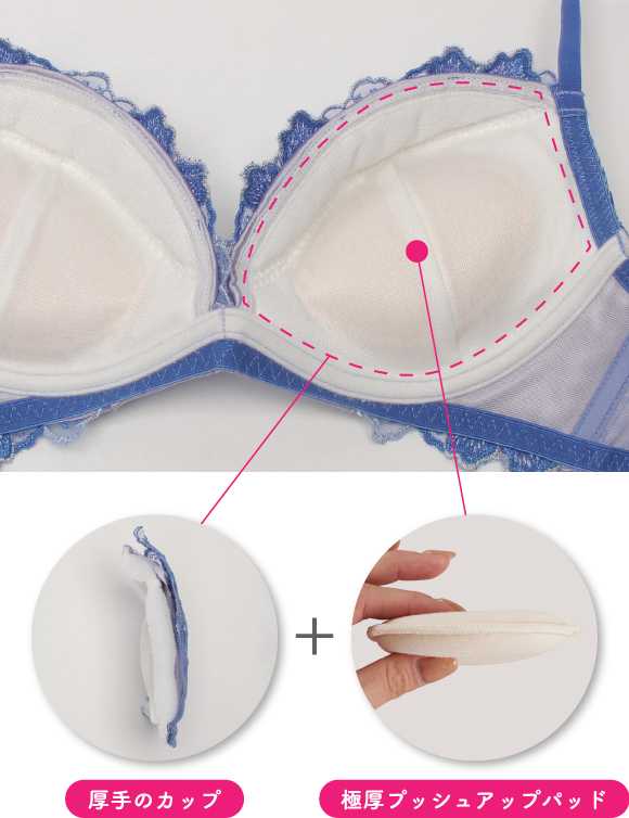 RAVIJOURの人気モデル「ホットリフトブラ」をベースに開発されたシンクアップブラは、厚手カップと9割を占める極厚プッシュアップパッドがポイント。