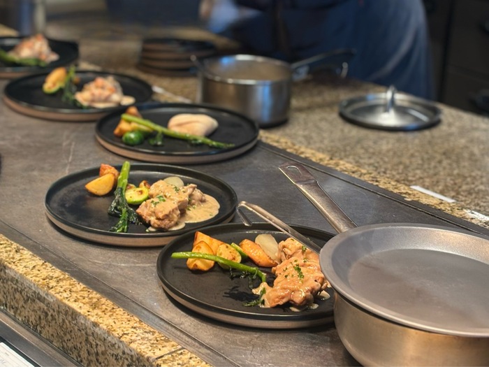 オープンキッチンでは、シェフが腕をふるう様子を間近で見ることができ、ライブ感満載です!色とりどりの、地元の食材や季節の食材をふんだんに使用した種類豊富な前菜のブッフェ、畑から飛び出してきたような、飾り付けや演出で、「農家」と繋がるレストランでありたいという思いが伝わります。