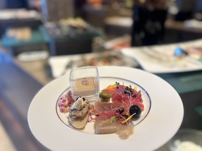 メインディッシュのほかに、前菜&スイーツは、ビュッフェから好きなものを盛り付けます。「サーモンマリネ ビーツ&オレンジ風味」や「バスク風オムレツ」など、お皿に盛り付けてゆくのも、ビュッフェの醍醐味!(予告なく変更となる場合があります。)