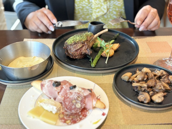 骨付きで豪快に焼き上げた「仔半のグリル ローズマリー」選べるサイドディッシュからは、なめらかな口当たりで芳醇な「ジャガイモのピューレ トリュフ風味」ガーリックの香りが食欲をそそる「マッシュルームのガーリックソテー」