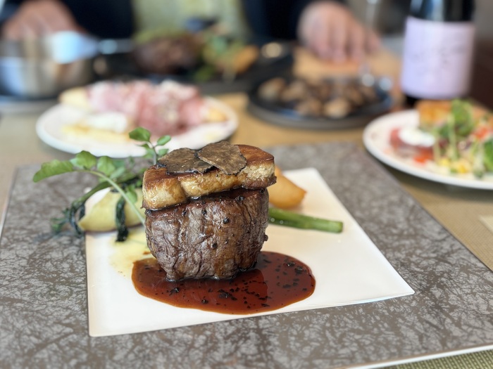 肉厚でジューシーなお肉の旨みが口いっぱいに広がる「国産牛テンダーロインのステーキ ロッシーニ風 ソース・ペリグー(+3,200円)」。
