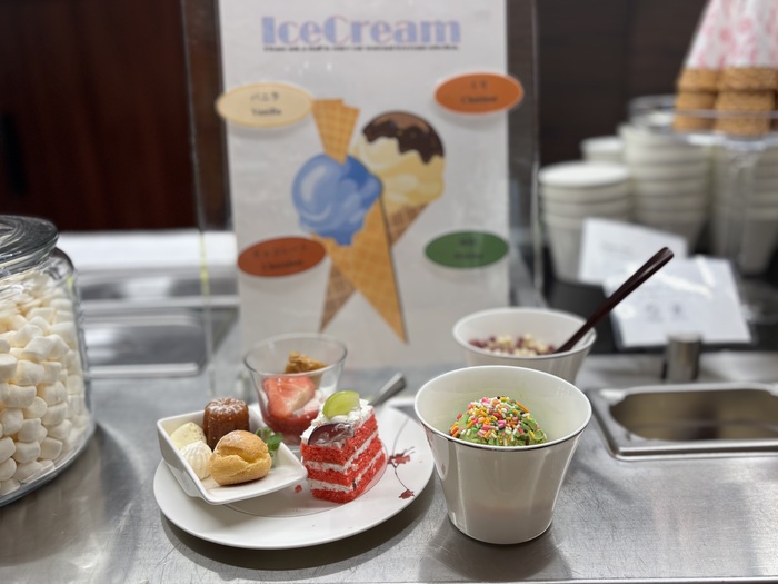 スイーツも本格的!なんとビュッフェコーナーには、アイスクリーム屋さん、アイスカートが登場!スタッフさんに、お好きなアイスクリームをカップかコーンかでオーダーします。自分好みにトッピングすると、世界に1つだけのアイスクリームが出来上がり、トッピングもたくさんあり、盛り付けが楽しくて、大人もついつい夢中になります。