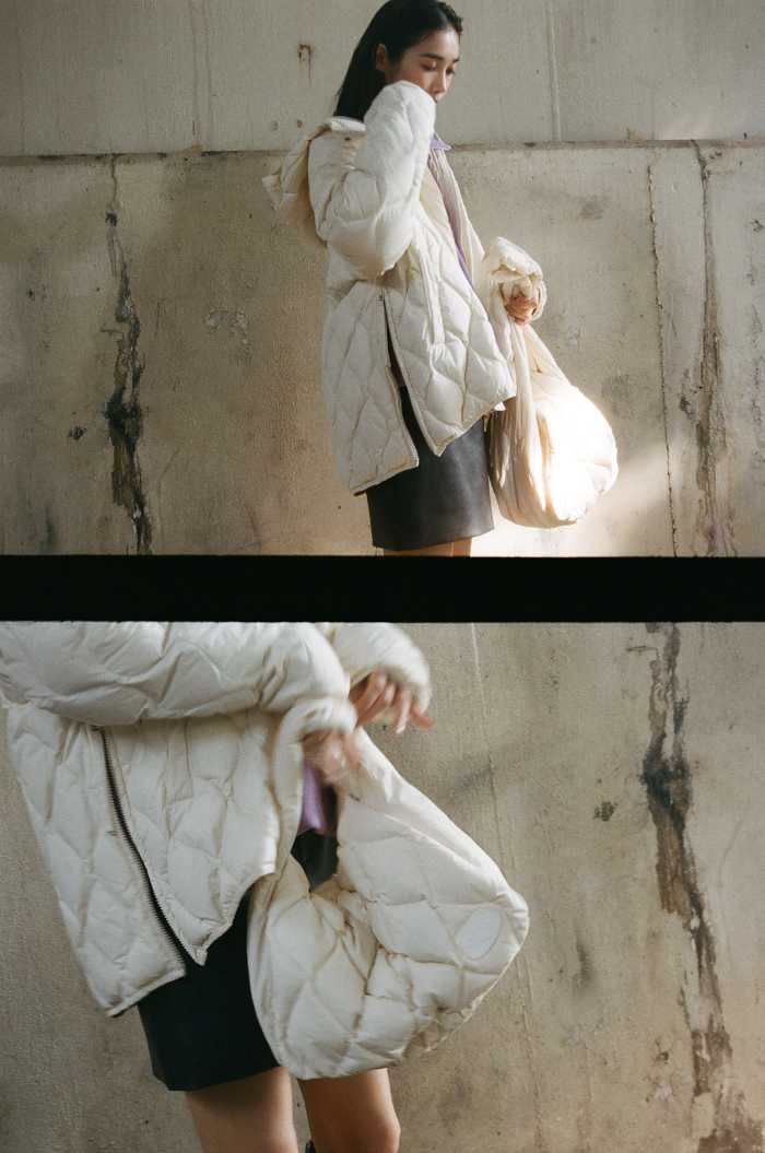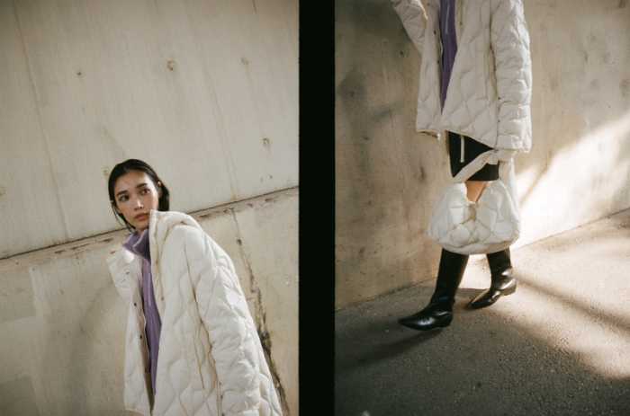 【emmi×TAION】キルティングコート(28,600円)は、ややオーバーサイズでゆったり着られる1枚。両脇にスリットファスナーを配し、動きやすく重ね着にも最適。
