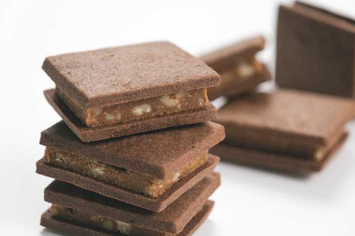 スナックミーの『ココアとくるみのキャラメルナッツサンド』は、キャラメルヌガーの煮詰め具合を絶妙にコントロールし、ねっちりとしないサクッと歯切れの良いキャラメルに仕上げたのが特徴。