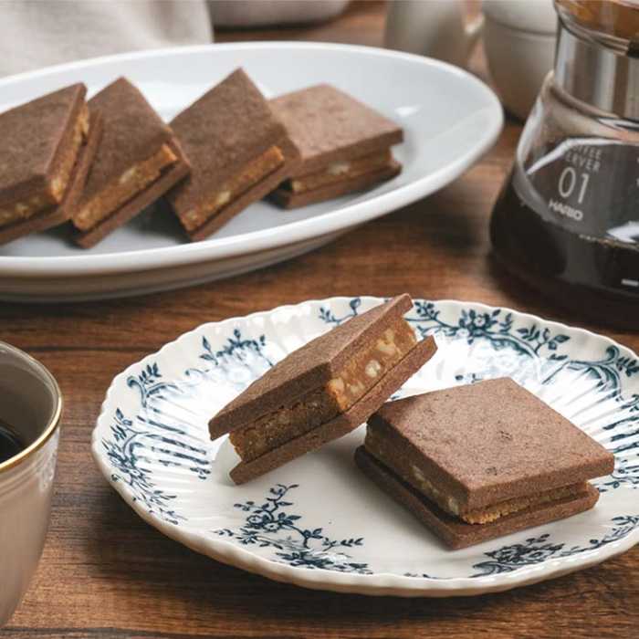 シンプルで素材にこだわったスナックミーの『ココアとくるみのキャラメルナッツサンド』は、寒い季節のティータイムをちょっと特別にしてくれるお菓子。