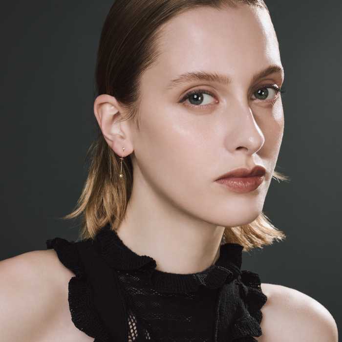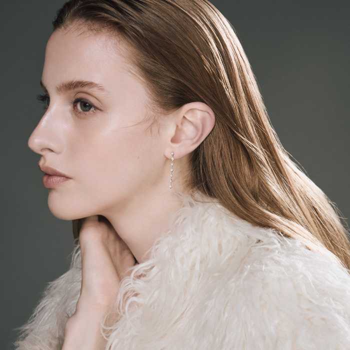 顔まわりを明るく照らすピアスは、動くたびに光を捉えてきらめくダイヤモンドが印象的。PTダイヤモンドピアス(¥136,400)は縦に連なるひし形デザインで、モダンな雰囲気をプラス。