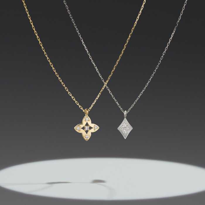 さらに、K10YGやK10WGを使用した小ぶりなネックレス(44,000円/41,800円)は、デイリーにも使いやすく、甘さを抑えたモダンな印象に。