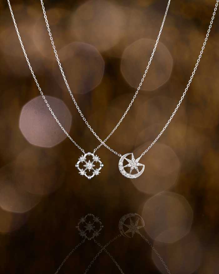 レースのような繊細な輝きを放つPTダイヤモンドネックレス(79,200e円/99,000円)は、三日月に星を閉じ込めたロマンティックなデザインが魅力。