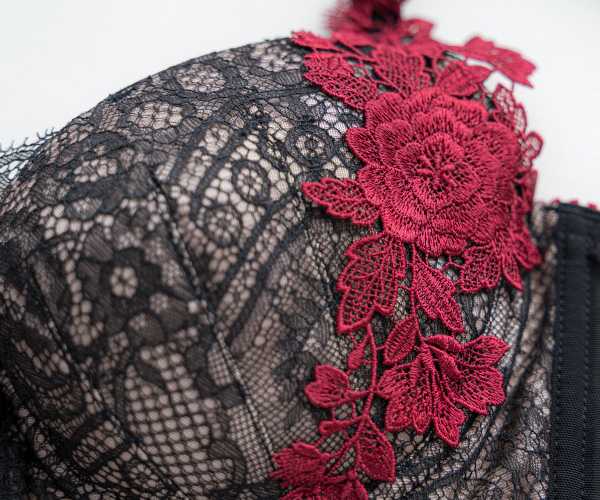 ホリデーシーズンにぴったりの刺繍レースは、糸を複雑に組み合わせた立体的な模様が印象的。アンティーク調のアイラッシュレースが、女性らしさを引き立ててくれます。